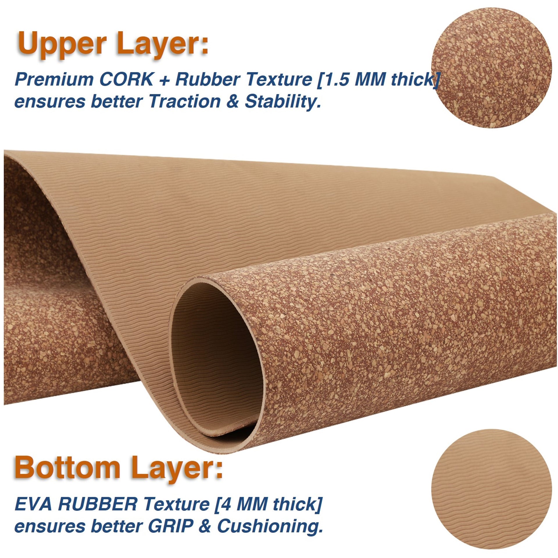 2️⃣【DURABLE & SUPERIOR CONSTRUCTION】: Naturally Harvested Cork Material helps absorb and dissipate body heat - High Quality Upper Cork Layer [1.5 MM] provides a Natural, Rich Touch & Feel and Stability, while Lower Layer of EVA Rubber [4 MM] provides Optimal Cushioning, Support & Grip. The Cork Brown Color is Elegant & Unisex.