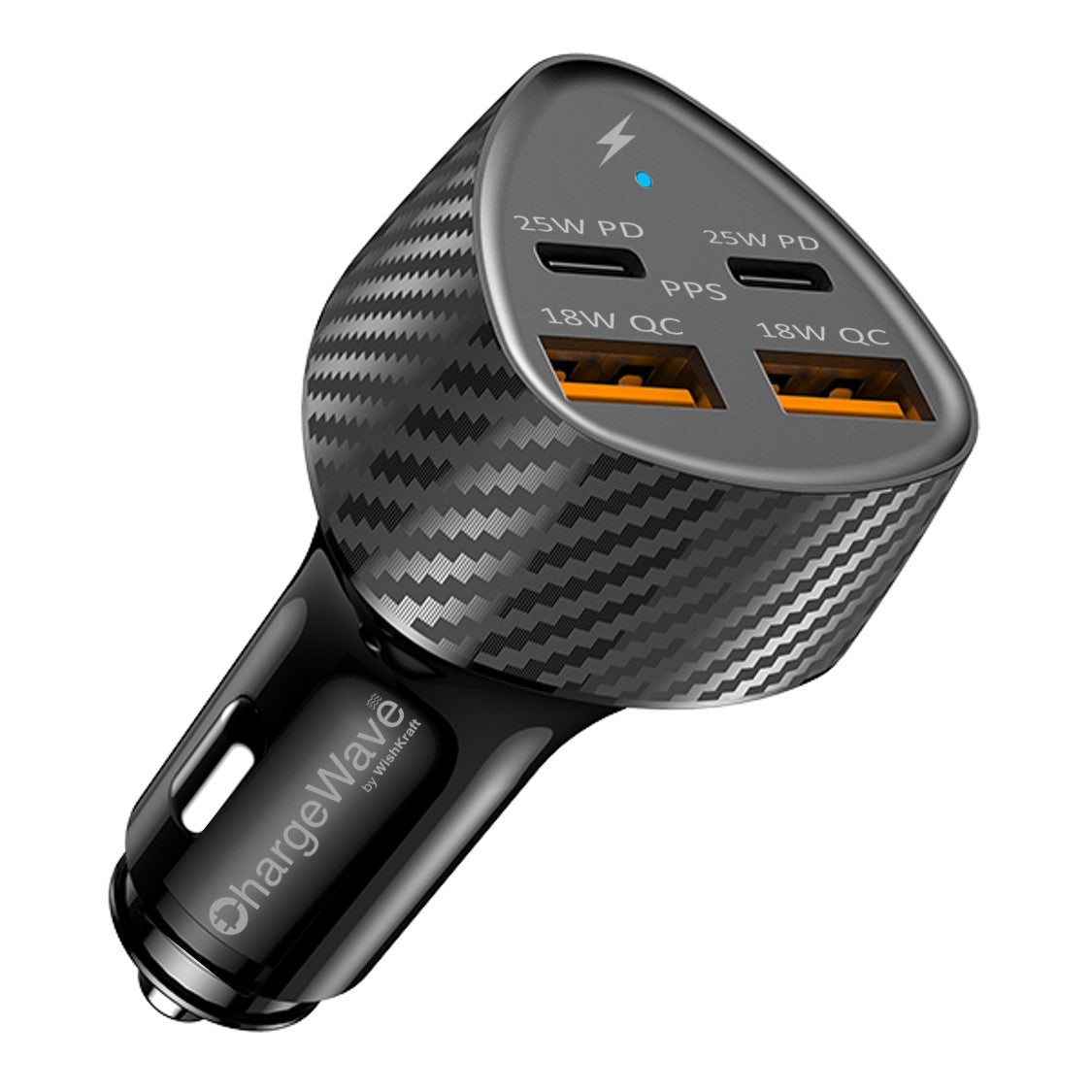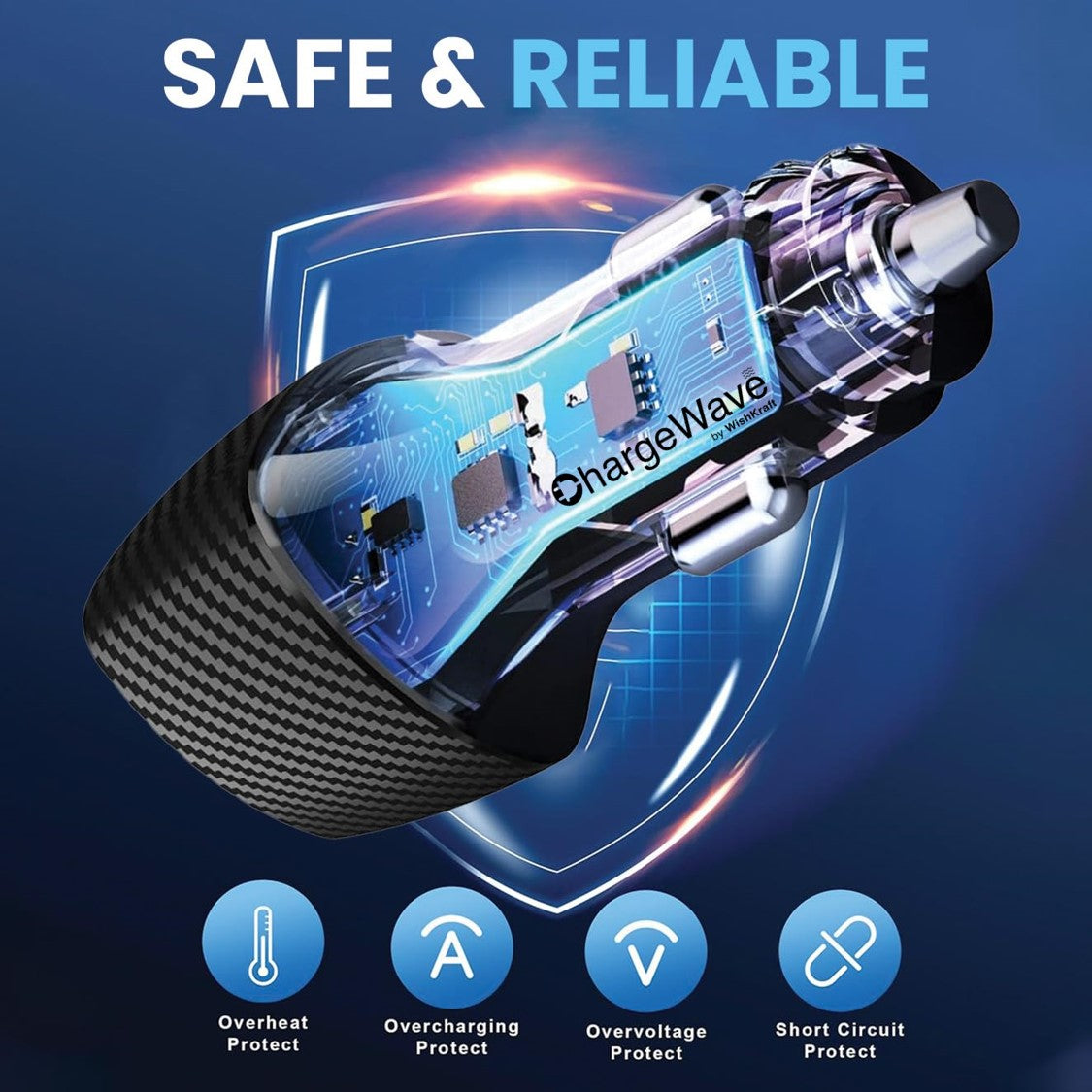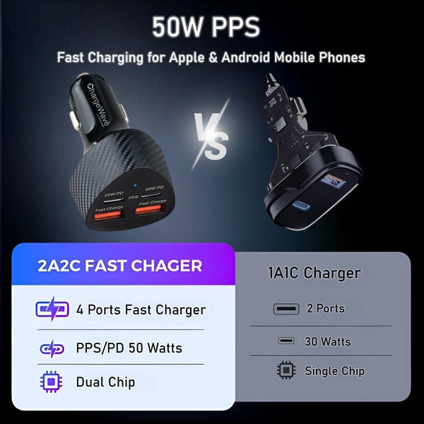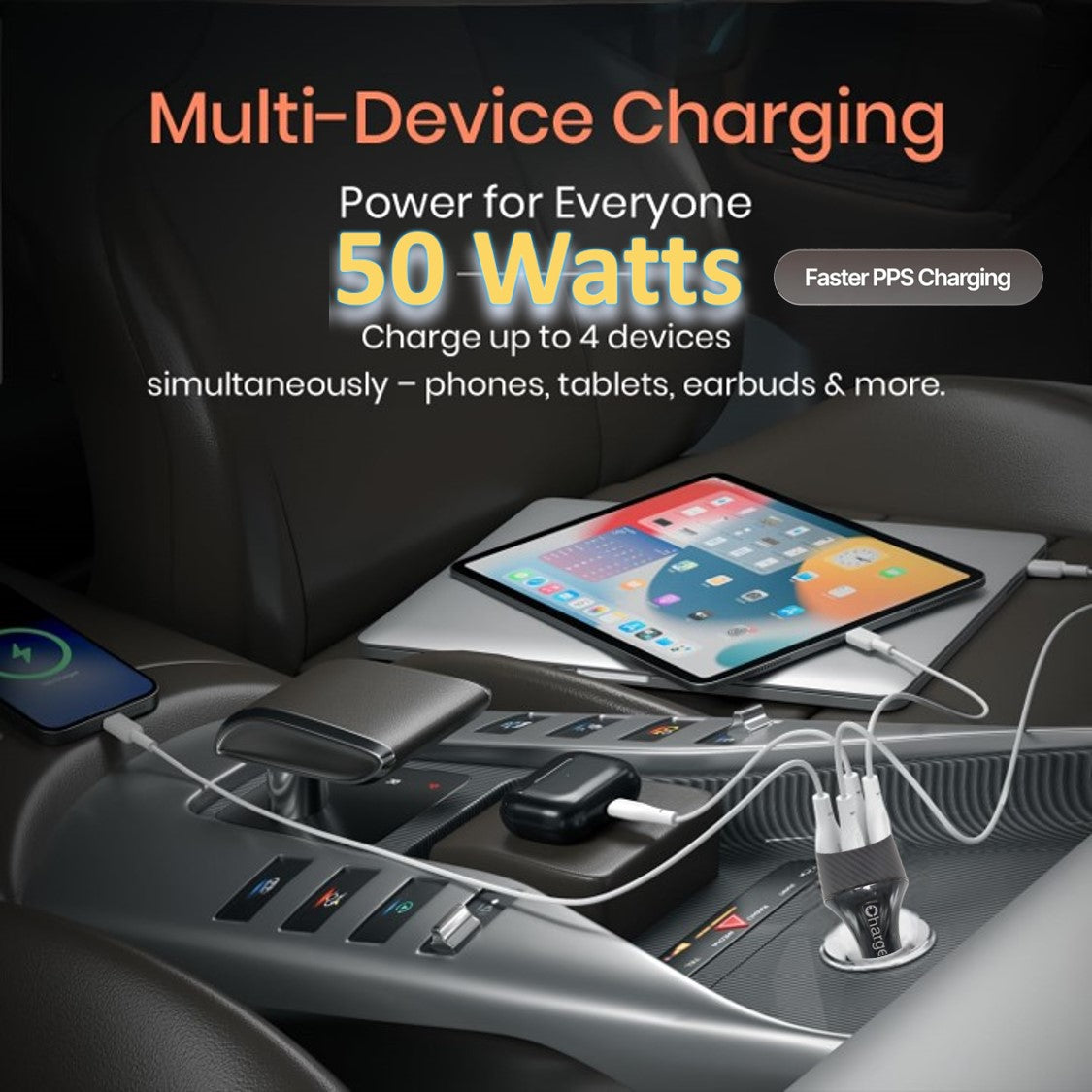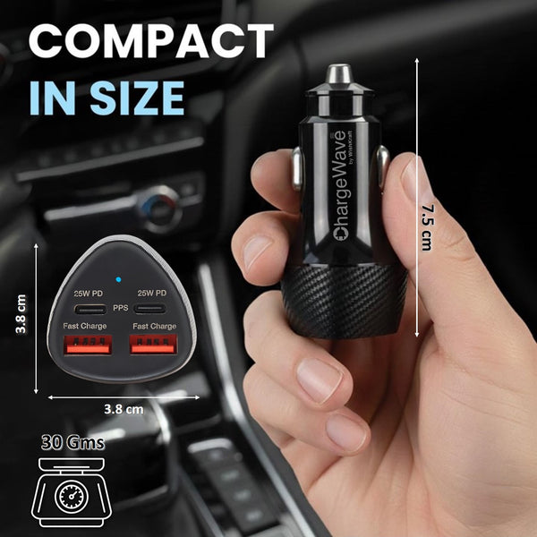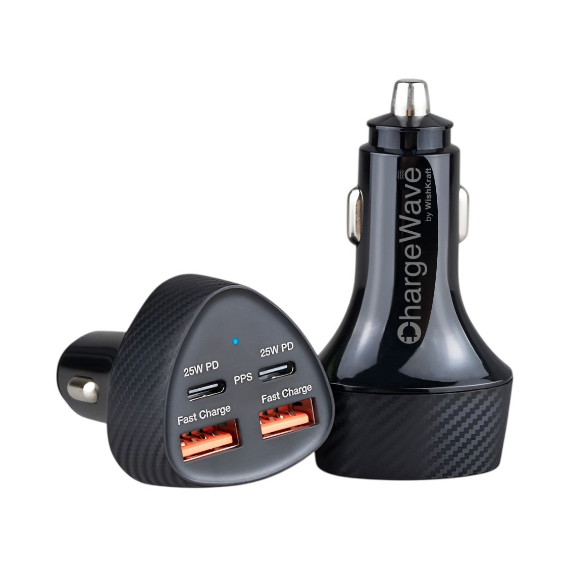 ChargeWave 4in1 Car Charger with 4 USB Ports & 50 Watts Total Max Output (18W QC USB-A +18W QC USB-A + 25W PD USB-C + 25W PD USB-C) | Fast Charging Mobile Phone Power Adapter for iPhone & Android Smartphones and TabletsΒ