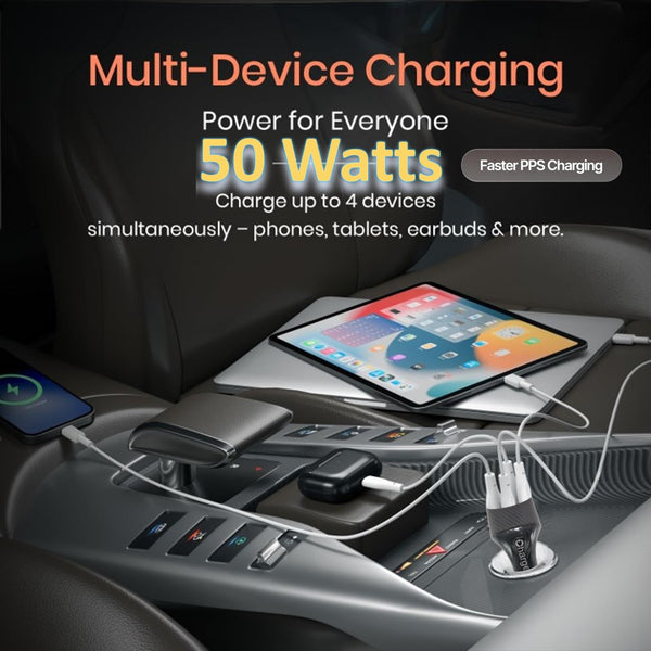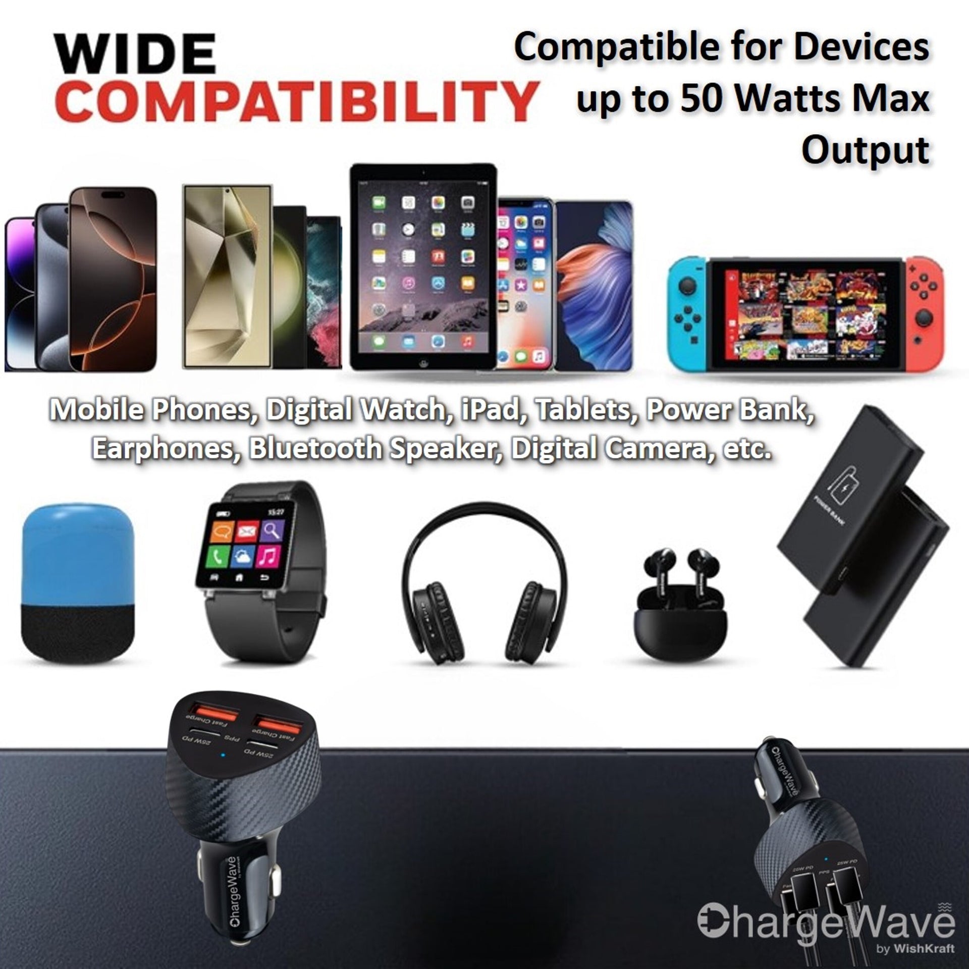 ChargeWave 4in1 Car Charger with 4 USB Ports & 50 Watts Total Max Output | Fast Charging Mobile Phone Power Adapter for iPhone & Android Smartphones and Tablets
