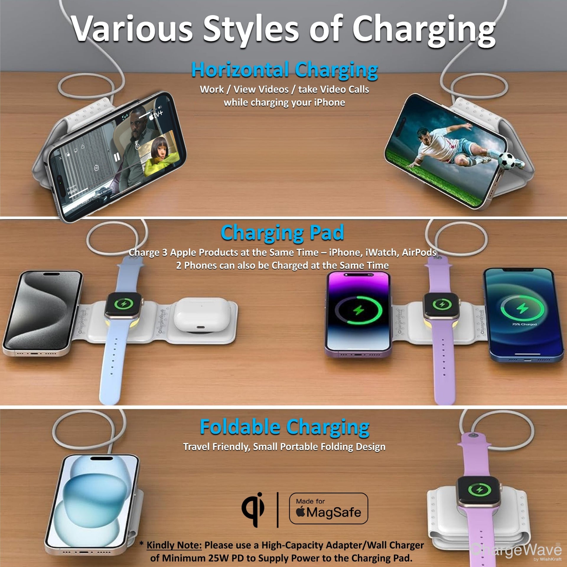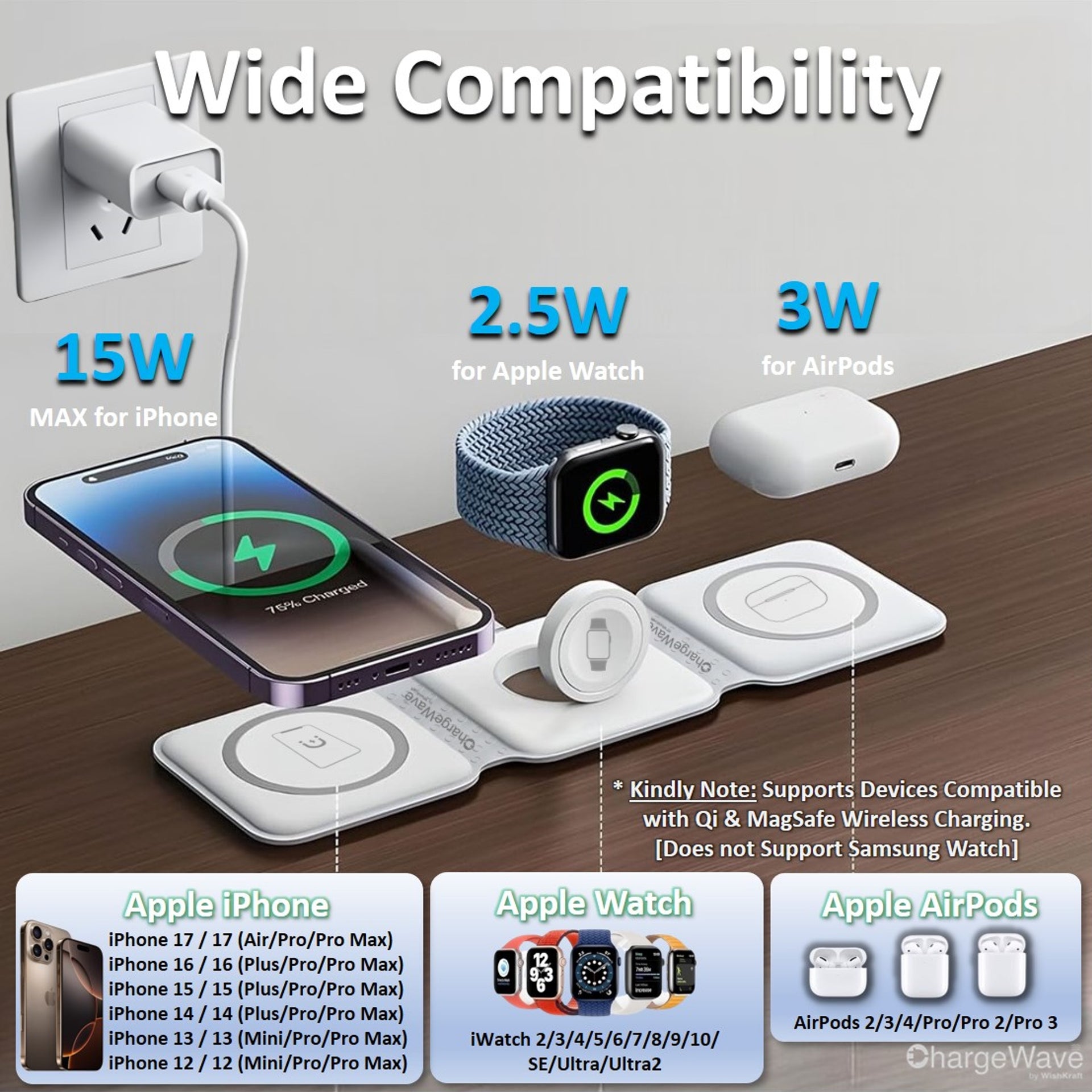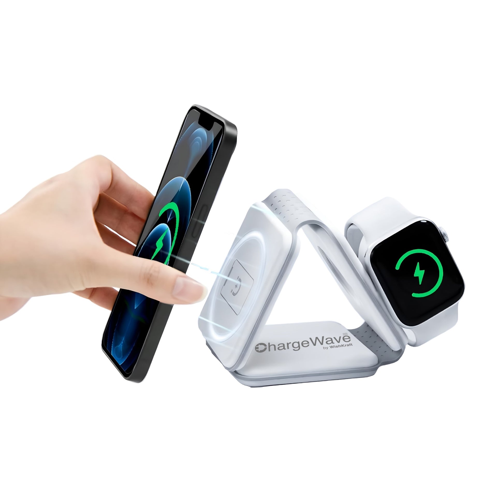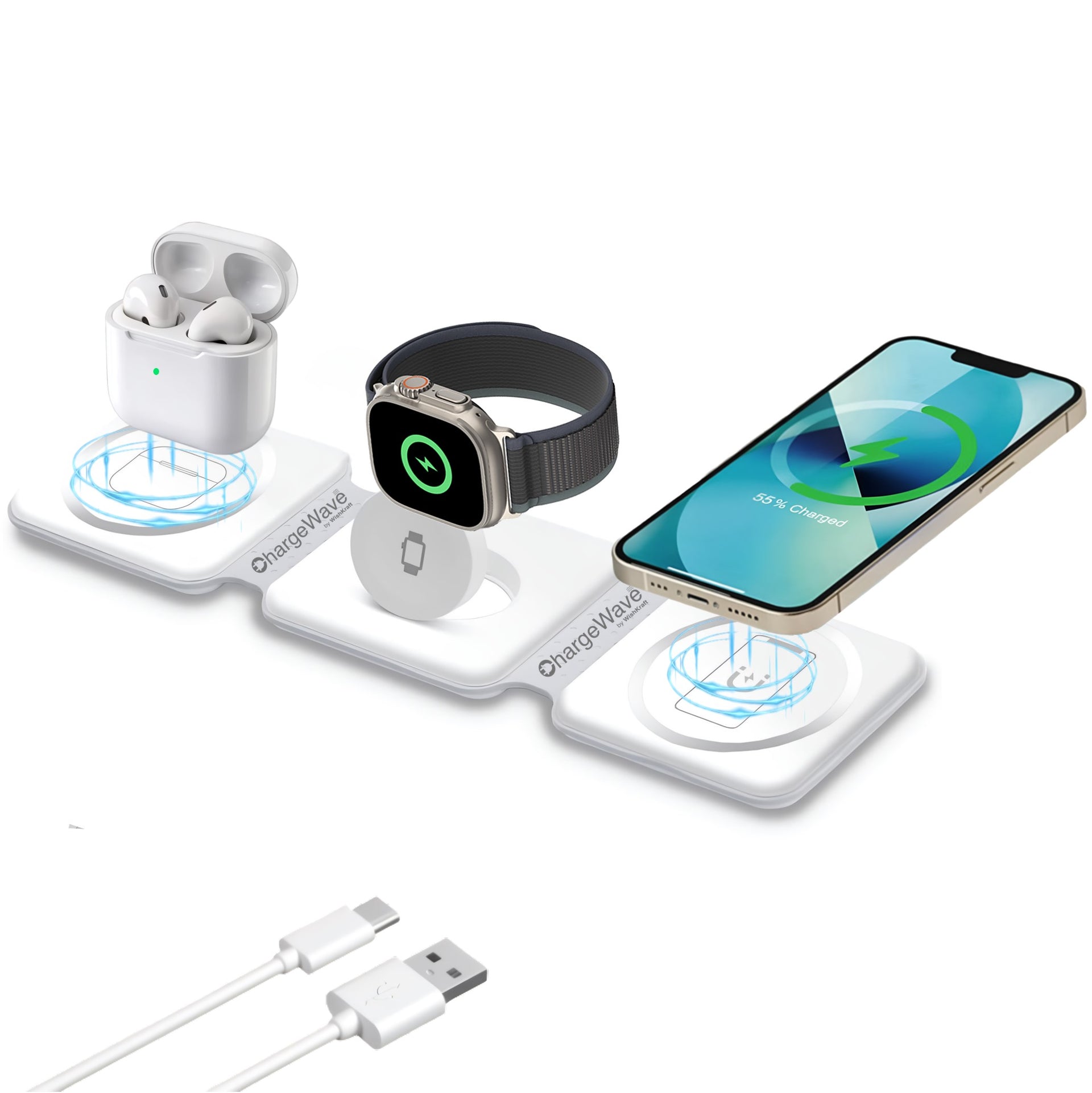 ChargeWave 3in1 MagSafe Wireless Charger for iPhone, AirPods & Apple Watch | Magnetic Foldable Charging Station Pad & Stand