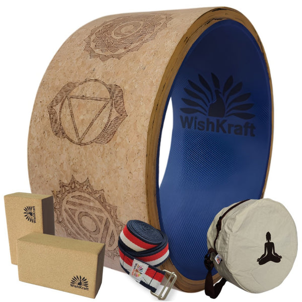 WishKraft WIDE Yoga Wheel Roller 13 x 6.25 inch [Cork Brown - 7 Chakras] with 2 Cork Blocks, Canvas Bag & Yoga Belt