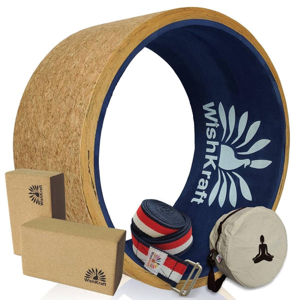 WishKraft Wide Yoga Wheel Roller 13 X 6.25 Inch [Cork Brown] with Canvas Bag, Yoga Belt & 2 Cork Blocks